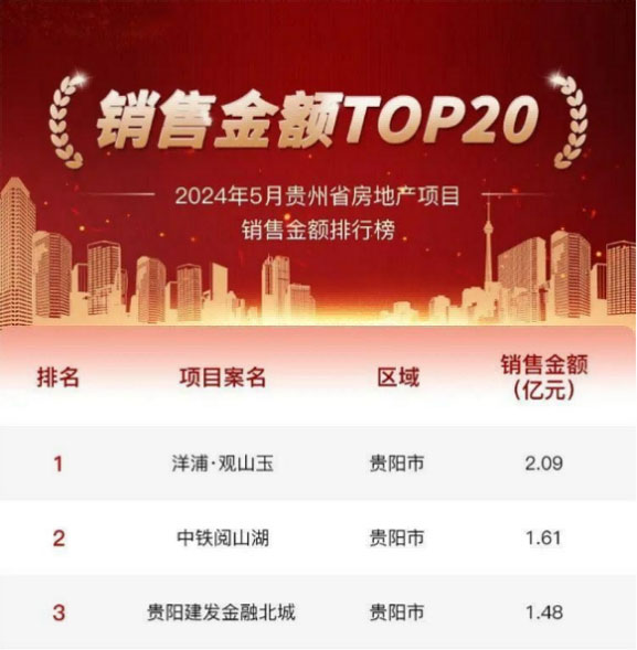 据贵州省房地产业协会消息:2024年5月,贵州省房地产销售金额前20强项目共计完成商品房销售1657套,实现销售金额18.43亿元。